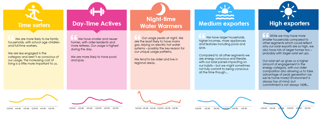 We re-ran the analysis with December 2023 – November 2024 energy usage patterns, and found that the Day-Time Actives and Time Surfers segments showed very similar consumption patterns. As a result, we’ve combined these two groups, with Time Surfers now absorbing the Day-Time Actives.