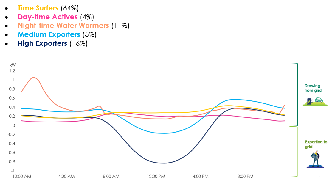 The graph below shows the 5 key usage patterns of households, which each curve representing the average behaviour of an individual household in that group, on an average in a 12-month peiord.